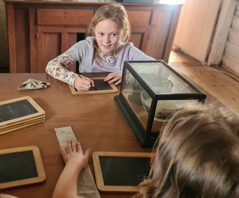 Students writing on slates in Kerikeri Mission House, Kerikeri. Image: LEARNZ.
