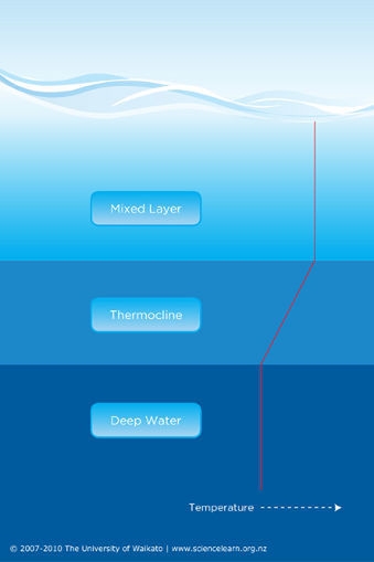 ,The ocean can be divided into three layers based on temperature: A mixed relatively warm layer, a thermocline where water cools with depth and a cold deep water layer. Image: University of Waikato www.sciencelearn.org.nz