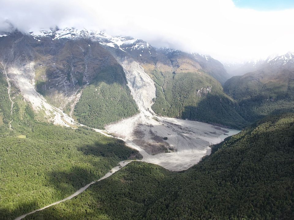 Landslides are also a common geohazard in New Zealand. This is the Dart landslide which has been active for several thousand years. On 4 January 2014 a large debris flow occurred; do you know what happened after this landslide? Image: Simon Cox, GNS Science.