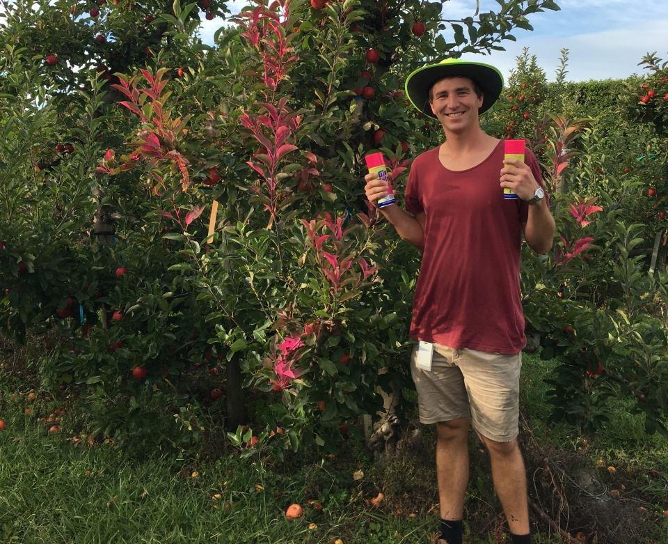 Matt proudly shares his apple tree trial tagging technique. Image: Supplied.